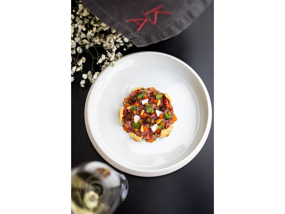 Jemně krájené hovězí v harmonii s pistáciovou majonézou a žloutkovým gelem. Precizní kombinace plnosti, krémovosti a svěžesti, doplněná křupavým pečivem.