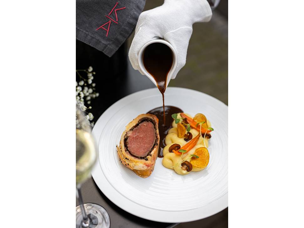 Šťavnaté maso v dokonale zapečeném kabátku, podávané s jemným bramborovým pyré a silnou masovou omáčkou. Hlavní chod večera, který spojuje tradici s noblesou